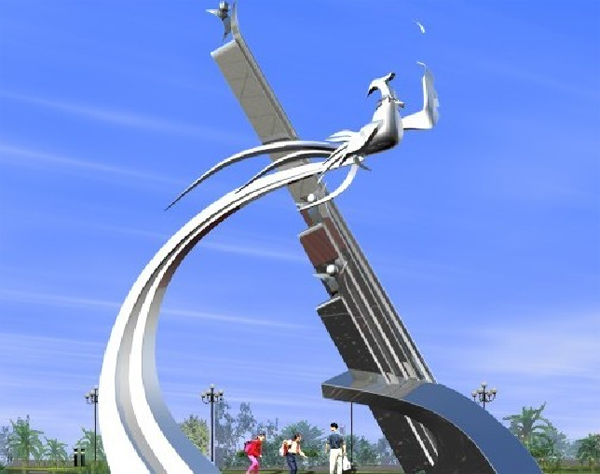 雕塑造型賦予強烈的現代風格,林立的樓宇,雀躍騰飛的鳳凰,以及巨浪騰空傾起。昭示的是這個都市化的城市日新月異的飛速發展,快節奏的生活模式。正如雕塑暗含的寓意“飛‘凰’騰達”。